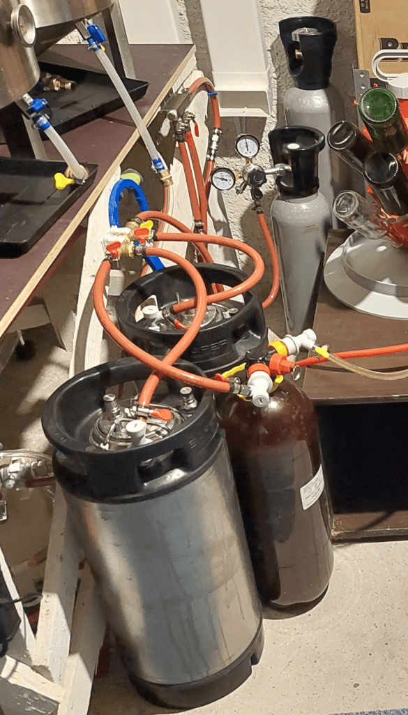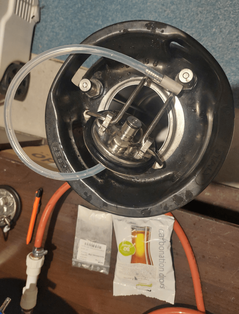 Carbonatarea se face dupa un “carbonation chart”, se mentine presiunea la 2-2.5 bari, apoi, zilnic, se scutura butoaiele, ca sa intre CO2ul intre moleculele de bere. Da, chinuiala. Deoarece in timpul maturarii, s-a folosit CO2 pt. a mai amesteca aromele, sita de inox in care stau aromele s-a rasucit si a iesit hamei, prin gaurile de sus, mai mari. S-au infundat furtunele de transfer spre KEG (purjare cu CO2, adaugare sita etc.).