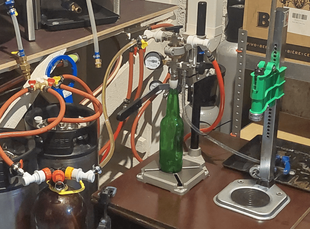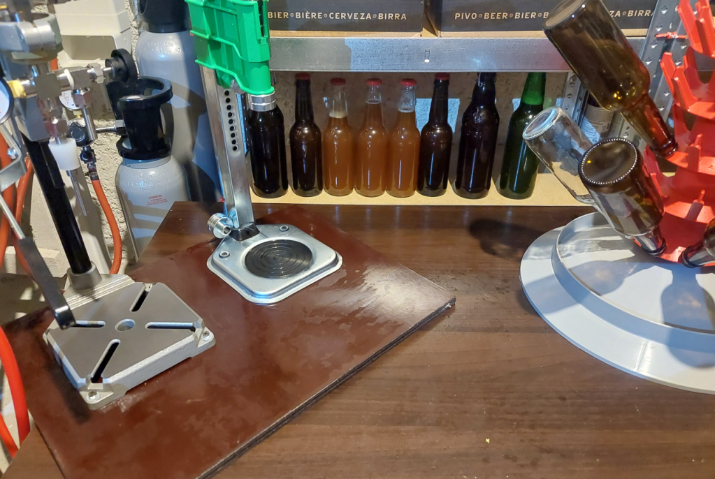 Dupa cateva explozii in față, a berii iesita cu presiune din sticla semiplina, am perfectionat sistemul de umplere si merge perfect. Dupa umplerea sticlei, urmeaza imediat capsarea capacelor.