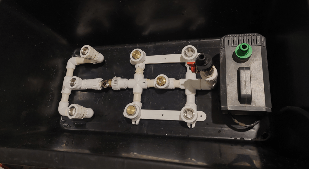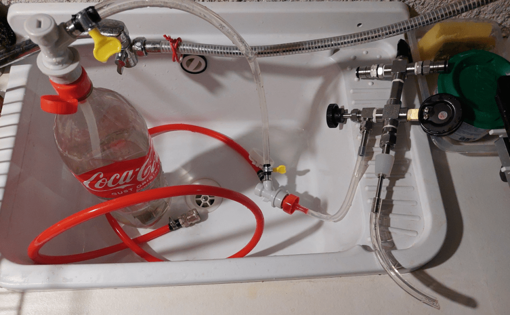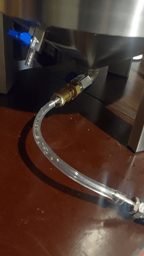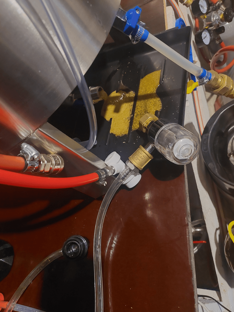 Deoarece aerarea inline nu merge cum trebuie, s-a gasit o solutie de aerare direct in fermentator, prin portul de jos, in timpul transferului. Unele poze sunt din timpul testelor cu apa. La aerarea mustului (si drojdiei din must) se foloseste un compresor electromagnetic (nu pe ulei) de aer destul de puternic.