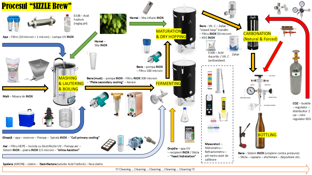 - curatare si dezinfectare: trebuie neaparat ambele, nici una nu este facultativa, se lucreaza cu drojdii, care raman prin toata mufele, doapele si incheieturile sistemului; asa ca trebuie eliminate